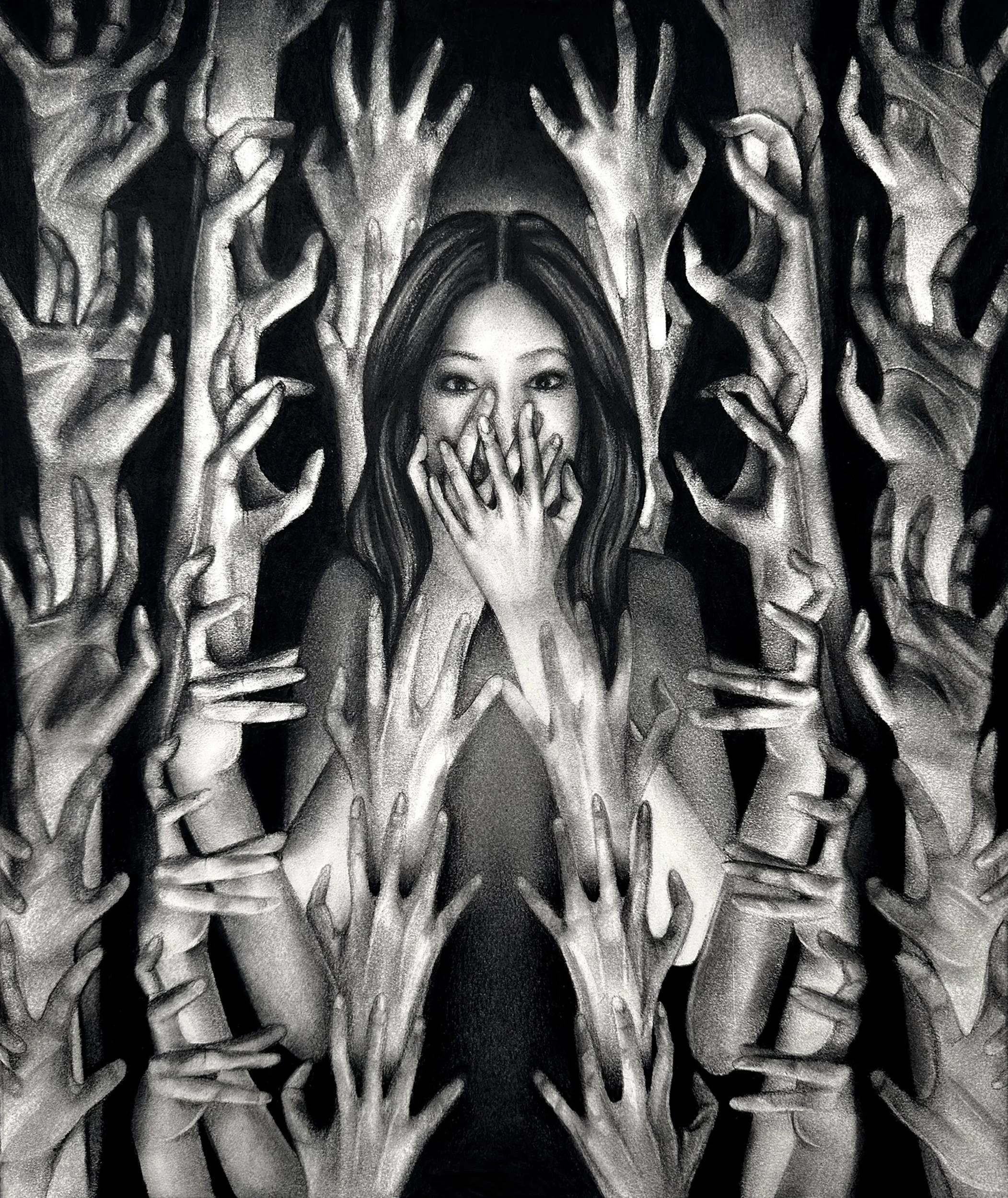 Manuel Silencing, 14” x 17”, Charcoal on paper, 2025