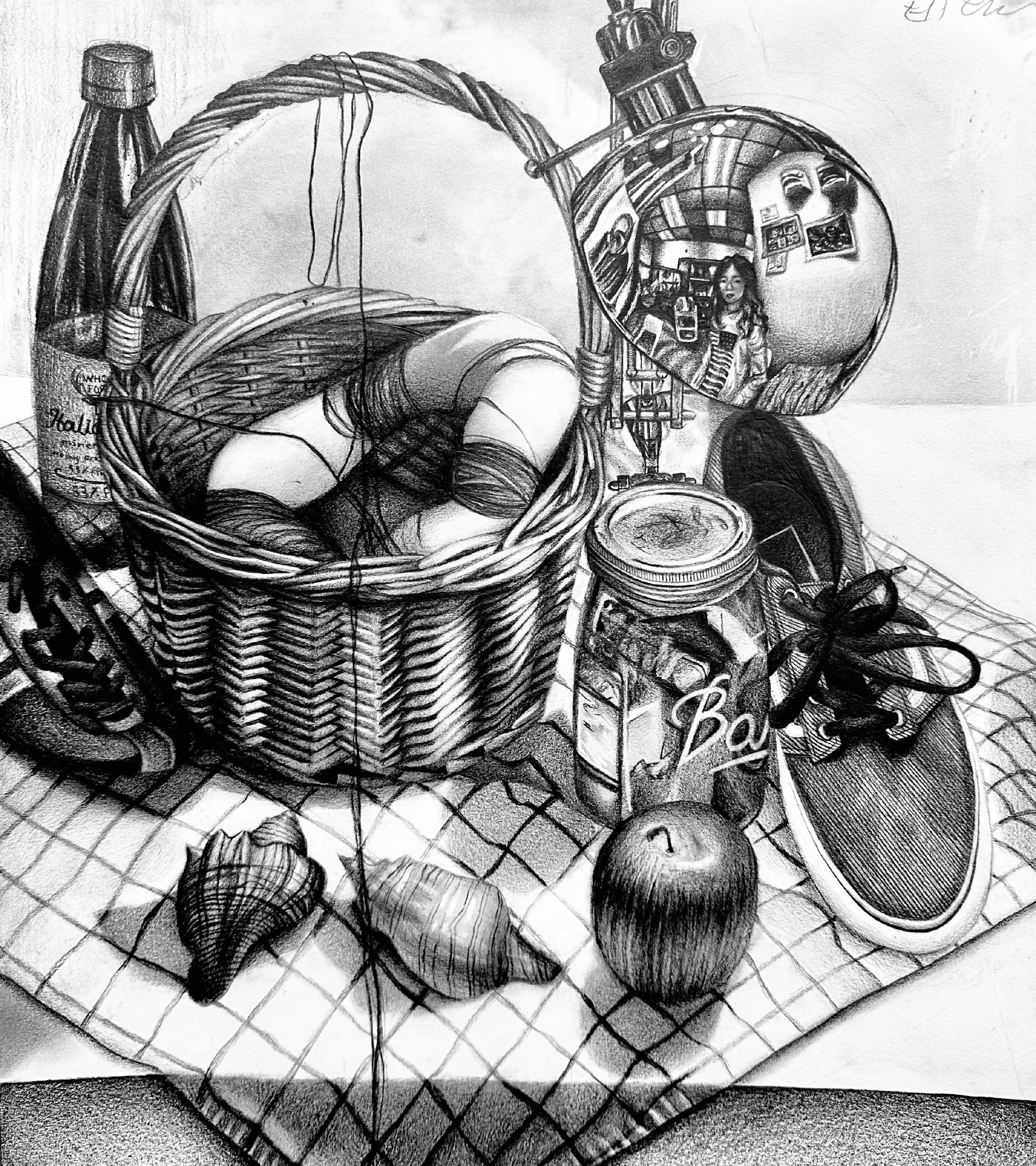 Picnics and Perspective, 14” x 17”, Pencil on paper, 2025